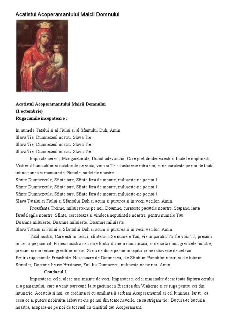 Acatistul acoperamantul maicii domnului pdf slava tie dumnezeul nostru slava tie. Acoperamantul tau indraznim a canta tie ca maicii lui dumnezeu unele ca acestea. Cuprinsi de viforul multor nevoi nascatoare de dumnezeu fecioara tu ne ajuta noua. Acatistul sfantului acoperamant al maicii domnului.