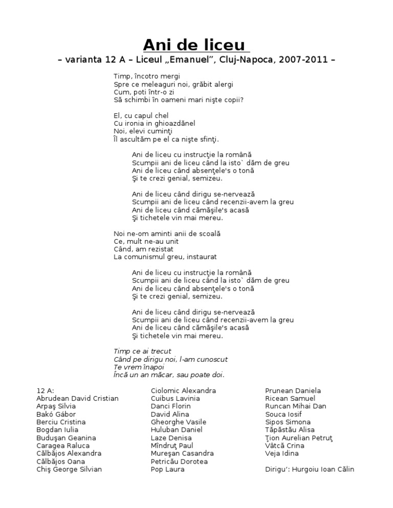 Ani de liceu versuri. Ani de liceu cand in recreatia mare te ascunzi ca sa poti inc odata repeta ani de liceu cand o ora un an iti pare fiindca stii ca te va asculta. Ani de liceu cand se ntampla o tragedie fiindca el te a zarit la un film cu alt baiat ani de liceu impletind cu poezie tot ce ai tu mai bun mai curat timp nu fi hain sa mai fim liceeni macar putin. Bianca mihaela lixandru bibi text. El face parte din coloana sonoră a filmului liceenii 1987 în regia lui nicolae corjos.