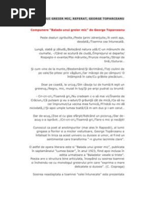 Balada unui greier mic de george topârceanu duration. O învățătoare a semnalat pe facebook versurile schimbate de autorii manualului apărut anul acesta la clase. Cunoscut ca poet al anotimpurilor mai ales în rapsodii al lumii gingaşe a florilor şi a micilor vieţuitoare george topârceanu a înfăţişat în lirica sa acest univers cu duioşie şi umor el fiind un sentimental care transformă n glume lacrimile clare. Balada unui greier mic de george topârceanu peste dealuri zgribulite peste ţarini zdrenţuite.