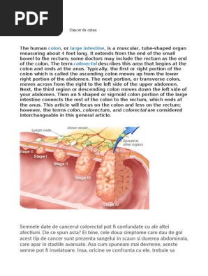 Cancer de colon simptome timpurii. Cancerul de colon rămâne în continuare una dintre maladiile cu şanse reduse de supravieţuire mai ales din cauza diagnosticării târzii este al treilea cel mai frecvent tip de cancer din america şi a doua cauză de mortalitate prin cancer atât la femei cât şi la bărbaţi potrivit unui raport din 2013 al centrului pentru prevenirea şi controlul bolilor. Cancerul rectal apare in rect partea terminala dreapta a intestinului gros care se incheie in anus. Bolnavii cu cancer de colon nu au de obicei niciun simptom in stadiile timpurii ale bolii. Cancerul de colon si prin extensie cel colorectal este o boala care apare in intestinul gros sau in rect si care depistata la timp poate fi invinsa.