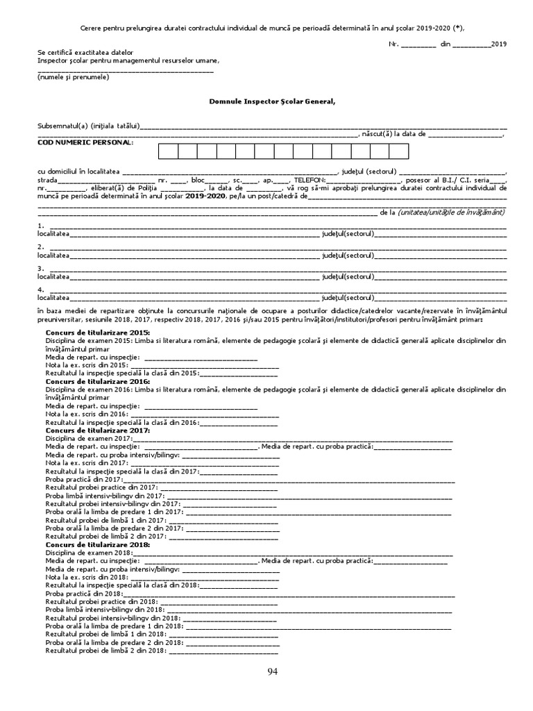Cerere Prelungirea Duratei Contractului De Munca Pentru Perioada Determinata In Anul Scolar 2019 2020