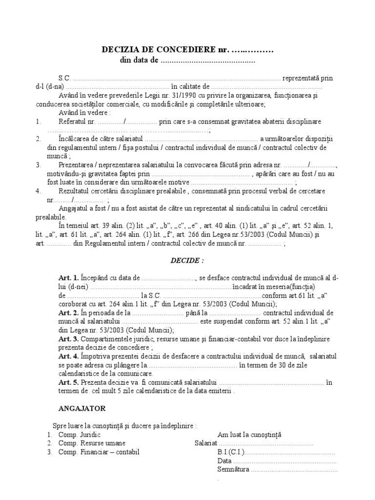 Decizie De Concediere Art 61 Lit A Model Itm