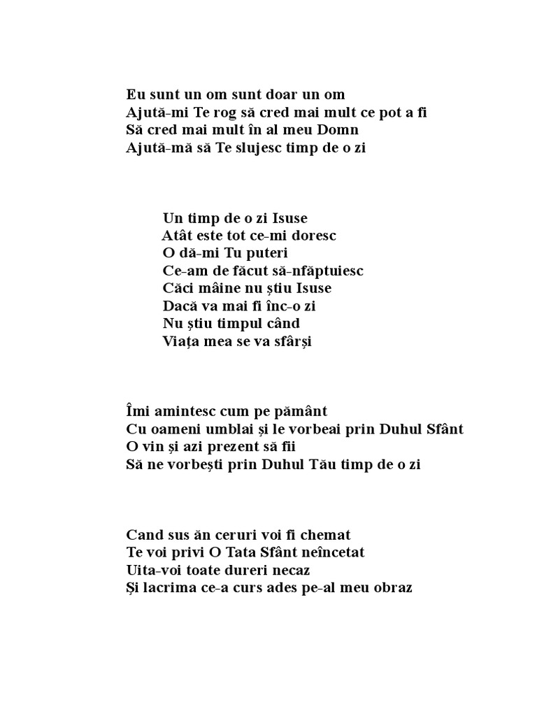 Eu sunt un om. Caci mâine nu stiu isuse daca va mai fi înc o zi nu stiu timpul când viata mea se va. Un timp de o zi isuse atat este tot ce doresc o da mi tu puteri ce am de facut sa nfaptuiesc caci maine nu stiu isuse daca va mai fi inca o zi nu stiu timpul cand viata mea se va sfarsi. Culegeam și nu se cunoștea că am cules. Eu sunt un om sunt doar un om ajuta mi te rog sa pot sa cred ce pot a fi sa sper mai mult in al meu domn invata ma sa te slujesc timp de o zi.