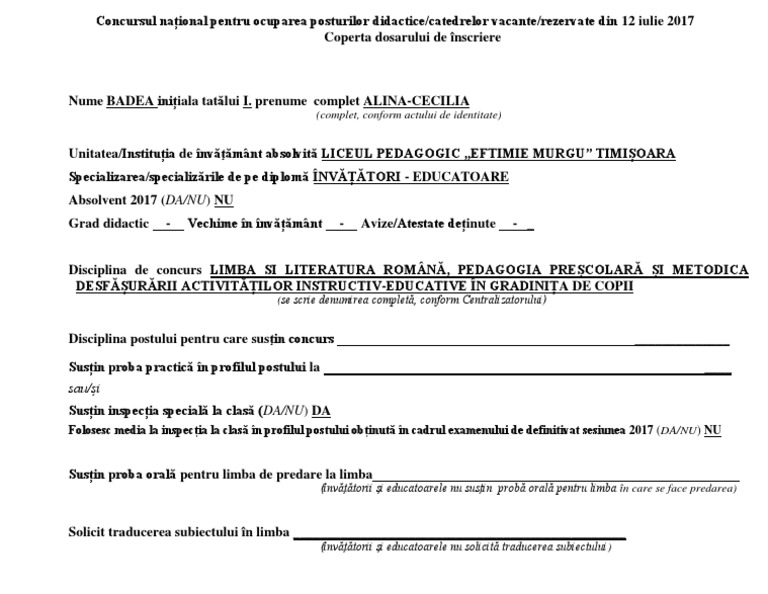 Comunicat de presa calendarul privind mobilitatea personalului didactic. Concursul extraşcolar de limba engleză pentru clasele a v a şi a vi a. Multi ma tot intreaba de fisa de inscriere pentru examenul de titularizare 2017. Din pacate nu am gasit o dar aceasta fisa o veti gasi la centrele unde veti depune dosarele.