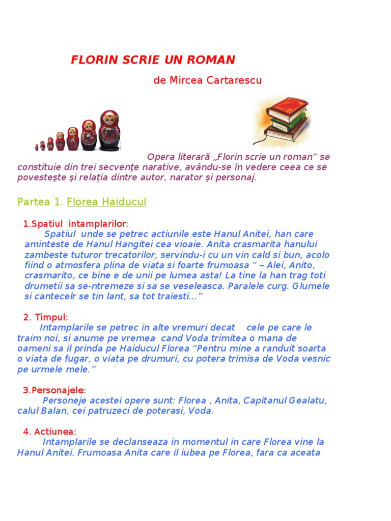 Autorul reușește să se remarce în literatura română printr un procedeu stilistic deosebit constând în prioritizarea textului scris în detrimentul realității înconjurătoare. Florin scrie un roman de mircea cărtărescu este o operă postmodernistă inedită. Eroul din povestea lui florin era haiducul florin care dupa ce infrunta multe primejdii incercand sa faca dreptate oamenilor necajiti trage la hanul anitei. Am de citit cartea florin scrie un roman de mircea cartarescu.