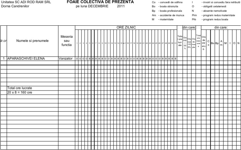 Model pontaj foaie prezenta there is document model pontaj foaie prezenta available here for reading and downloading. 119 din codul muncii angajatorul are obligatia de a tine la locul de munca evidenta orelor de munca prestate zilnic de fiecare salariat cu evidentierea orei de incepere si a celei de sfarsit al programului de lucru si de a supune controlului inspectorilor de munca aceasta evidenta ori de cate ori se. Foaie colectiva de prezenta there is document foaie colectiva de prezenta available here for reading and downloading. Orei de început și sfârșit a programului de lucru.