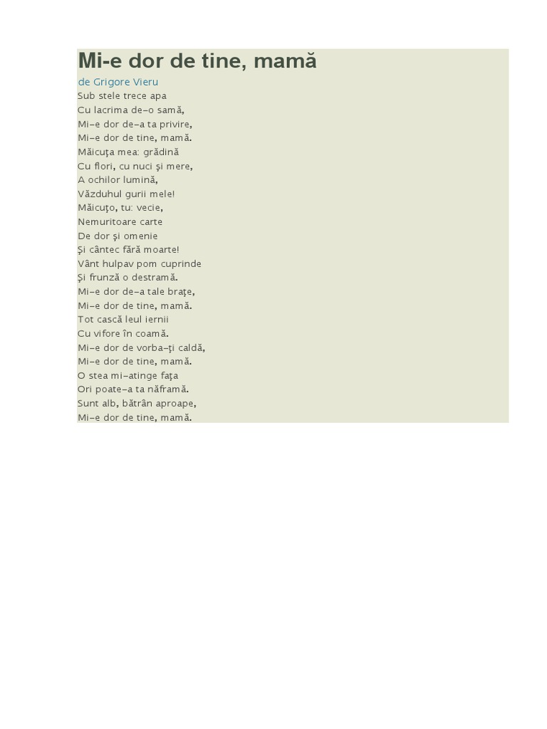 Mi E Dor De Tine Mamă Versuri Grigore Vieru