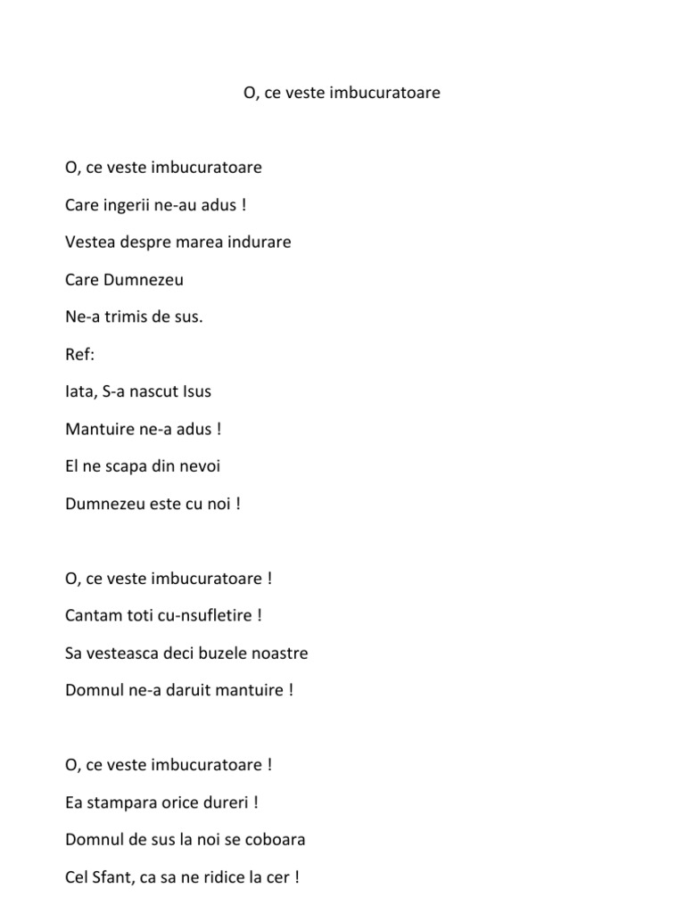O ce veste îmbucurătoare cântăm toţi cu însufleţire să vestească deci buzele noastre. Că la betleem maria săvârşind călătoria într un mic sălaş lângă acel oraş a născut pe mesia. Dumnezeu este cu no.