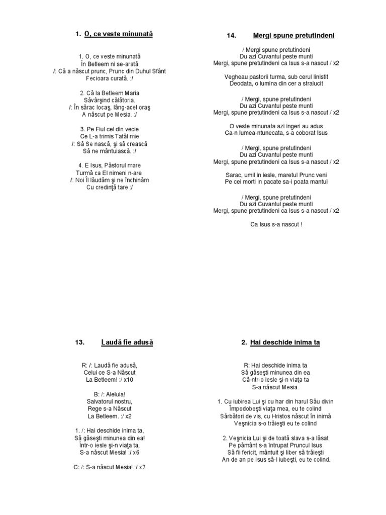 O ce veste imbucuratoare. Domnul de sus la noi se coboară cel sfânt ca să ne ridice la cer. O ce veste îmbucurătoare care îngerii ne au adus veste despre marea îndurare care dumnezeu ne a trimis de sus. O ce veste îmbucurătoare ea astâmpără orice dureri. în betleem ni s arată astăzi s a născut cel făr de nceput cum au zis prorocii.