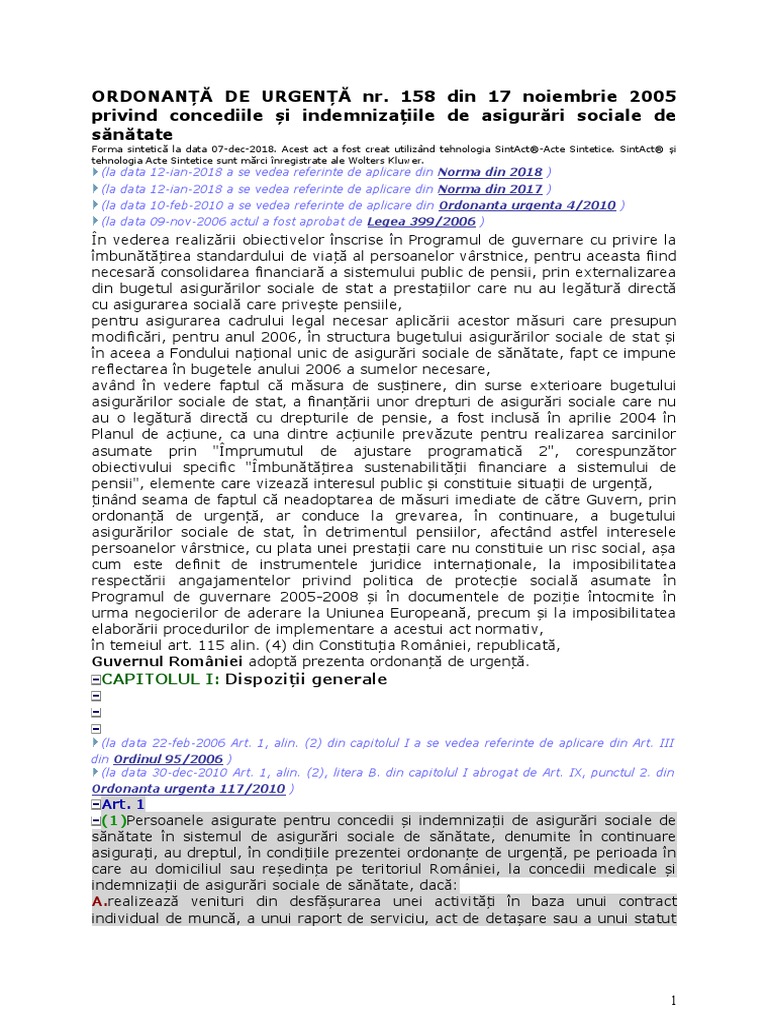 Ordonanta de urgenta oug 158 2005 privind concediile şi indemnizaţiile de asigurări sociale de sănătate. 31 din 12 ianuarie 2018. 1 concediile si indemnizatiile prevazute de o u g. 158 2005 aprobată cu modificări și completări prin legea nr.