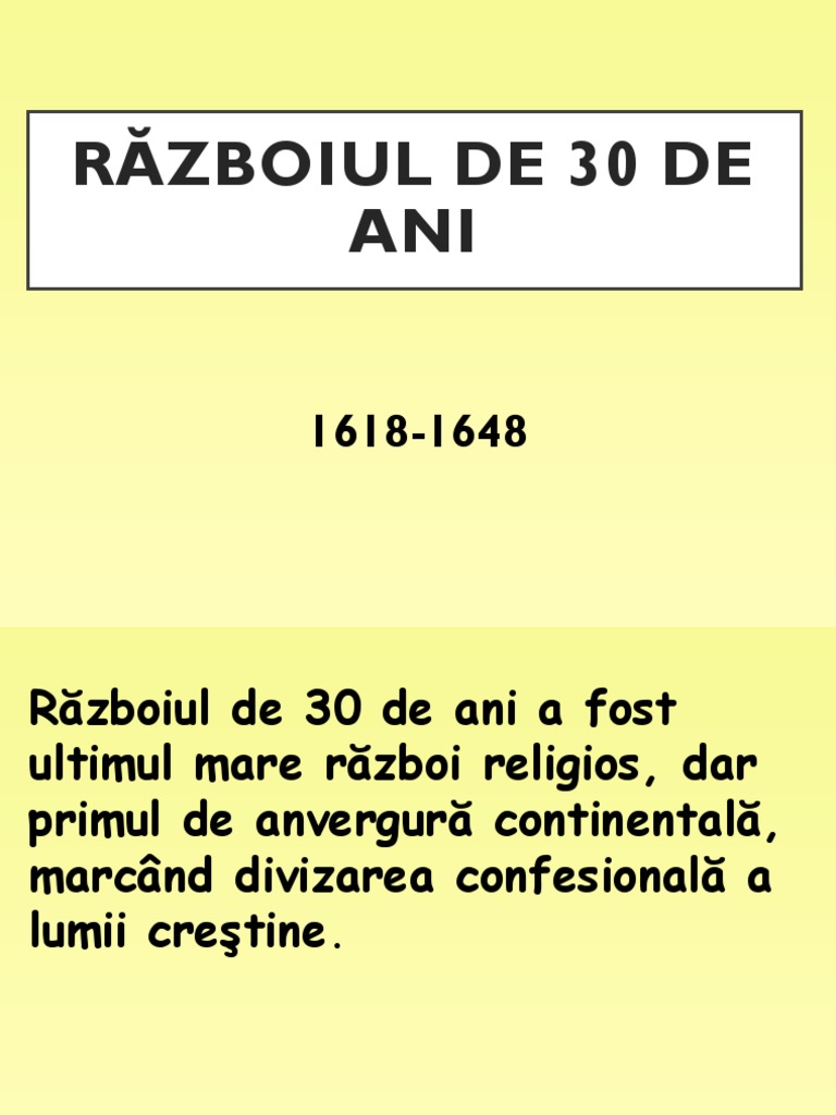 Războiul de 30 de ani 1618 1648 războiul de 30 de ani a fost ultimul mare război medieval religios dar si primul război modern al intereselor naţionale marcând divizarea europei pe criterii statale. Powerpoint presentation last modified by. Material ppt clasa a ix. Razboiul de 30 de ani 1618 1648 scoala nr.