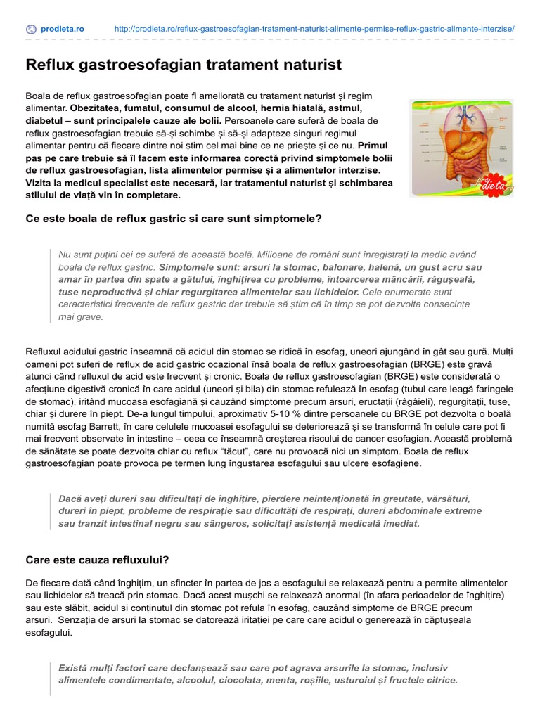 Cicatricile pot fi adesea șterse prin metode de tratament endoscopice. Refluxul gastroesofagian o problemă de sănătate larg răspândită în rândul ambelor sexe se traduce prin urcarea acidului gastric din stomac în esofag. Tratament clasic pentru boala de reflux gastroesofagian. Tratament naturist pentru boala de reflux gastroesofagian.