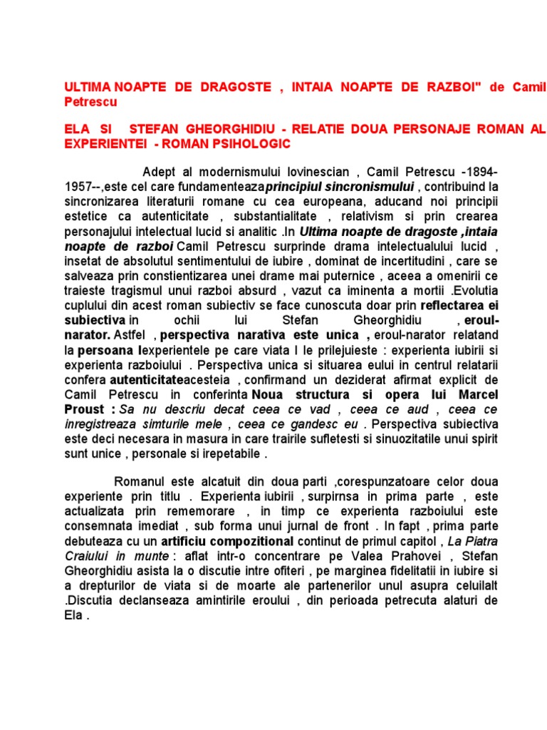 Doc Relatia Dintre Doua Personaje Stefan Gheorghidiu Si Ella Ultima Noapte De Dragoste Intaia Noapte De Razboi De Camil Petrescu Elena Grigorescu Academia Edu