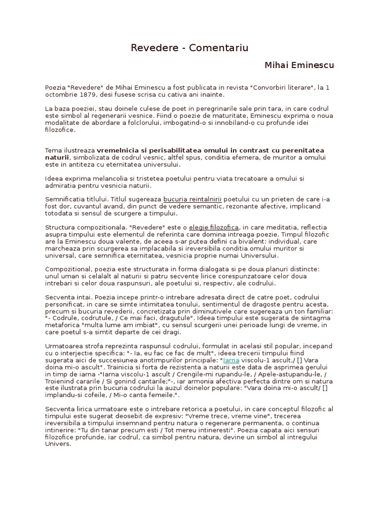 Poezia revedere a fost scrisă de mihai eminescu și face parte din creația de maturitate a poetului. Ia eu fac ce fac de mult iarna viscolu l ascult crengile mi rupindu le apele astupindu le troienind cararile si gonind cântarile. Poezia revedere de mihai eminescu 1850 1889 a fost publicată în revista convorbiri literare la 1 octombrie 1879 deşi fusese scrisă cu câţiva ani înainte. Mai multe informatii despre mihai eminescu gasiti la.