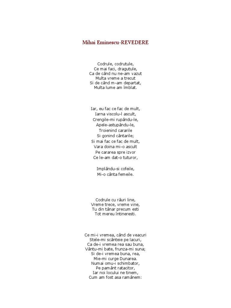 Si mai fac ce fac de mult vara doina mi o ascult pe cararea spre izvor ce le am dat o tuturor implindu si. Codrule codruțule ce mai faci drăguțule că de când nu ne am văzut multă vreme au trecut și de când m am depărtat multă lume am îmblat. Revedere codrule codruţule ce mai faci drăguţule că de când nu ne am văzut multă vreme au trecut şi de când m am depărtat multă lume am umblat. Eminescu a adus prin opera sa o limba noua si mereu proaspata.