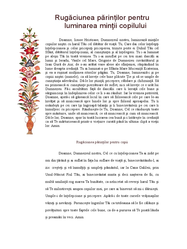 Rugaciunea parintilor pentru copii doamne dumnezeul nostru cel ce cu intelepciunea ta ai zidit pe om din tarana si ai suflat in fata lui suflare de viata si binecuvantandu l ai zis cresteti si va inmultiti si umpleti pamantul iar la cana galileii prin unul nascut fiul tau ai binecuvantat nunta si deci nasterea de fii cu multa umilinta rog marea ta bunatate ca neincetat sa reversi. Ocroteşte i prin rugăciunile tale fii lor povăţuitor pe calea adevărului şi fereşte i de toată ispita. Fii lor călăuză pe marea cea învolburată a vie ţii. Acesta este motivul pentru care aceștia intervin în fața lui dumnezeu prin rugăciunea părinților pentru copiii lor.