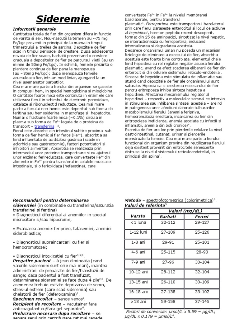 Analiza poate fi decontată cas casaopsnaj pe baza biletului de trimitere de la medicul de familie de specialitate valabil doar în județele în care bioclinica are contract cas arad bihor bistrița năsăud brașov bucurești cluj constanța dolj gorj hunedoara iași mureș timiș casaopsnaj arad bucurești cluj mureș. Cresteri talasemie anemii sideroblastice anemii hemolitice hemocromatoza idiopatica sideremia crescuta poate indica supraincarcarea cu fier mai devreme decat cresterea feritinei si secundara transfuzii multiple tratament inadecvat cu fier sunt porto cav dializa cronica etc intoxicatie acuta cu fier la copii necroza hepatica severa hepatite virale acute. Sunt încadrate în valorile normale fără excepție. Organismul unui adult conține 4 5 g de fier din care cea mai mare parte 65 70 se găsește sub formă de hem care se combină cu diferite proteine alcătuind hemoproteinele hemoglobină mioglobină și enzime heminice care reprezintă forma funcționala activă a fierului.