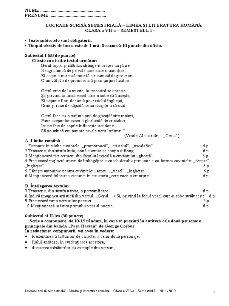 Tezele cu subict unic programa limba si literatura romana clasa aviii a. Teză limba si literatura romana clasa a vii a. 0 stele 0 review uri. Lucrare scrisă semestrială semestrul al ii lea clasa a vii a subiect şi barem de corectare.