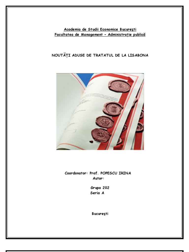 Mai jos poate fi vizualizat cuprinsul si un extras din document aprox. Profesor indrumator prezentat profesorului. Acest referat descrie tratatul de la lisabona. Iti recomandam sa te uiti bine pe extras cuprins si pe imaginile oferite iar daca este ceea ce ti trebuie pentru documentarea ta il poti descarca.
